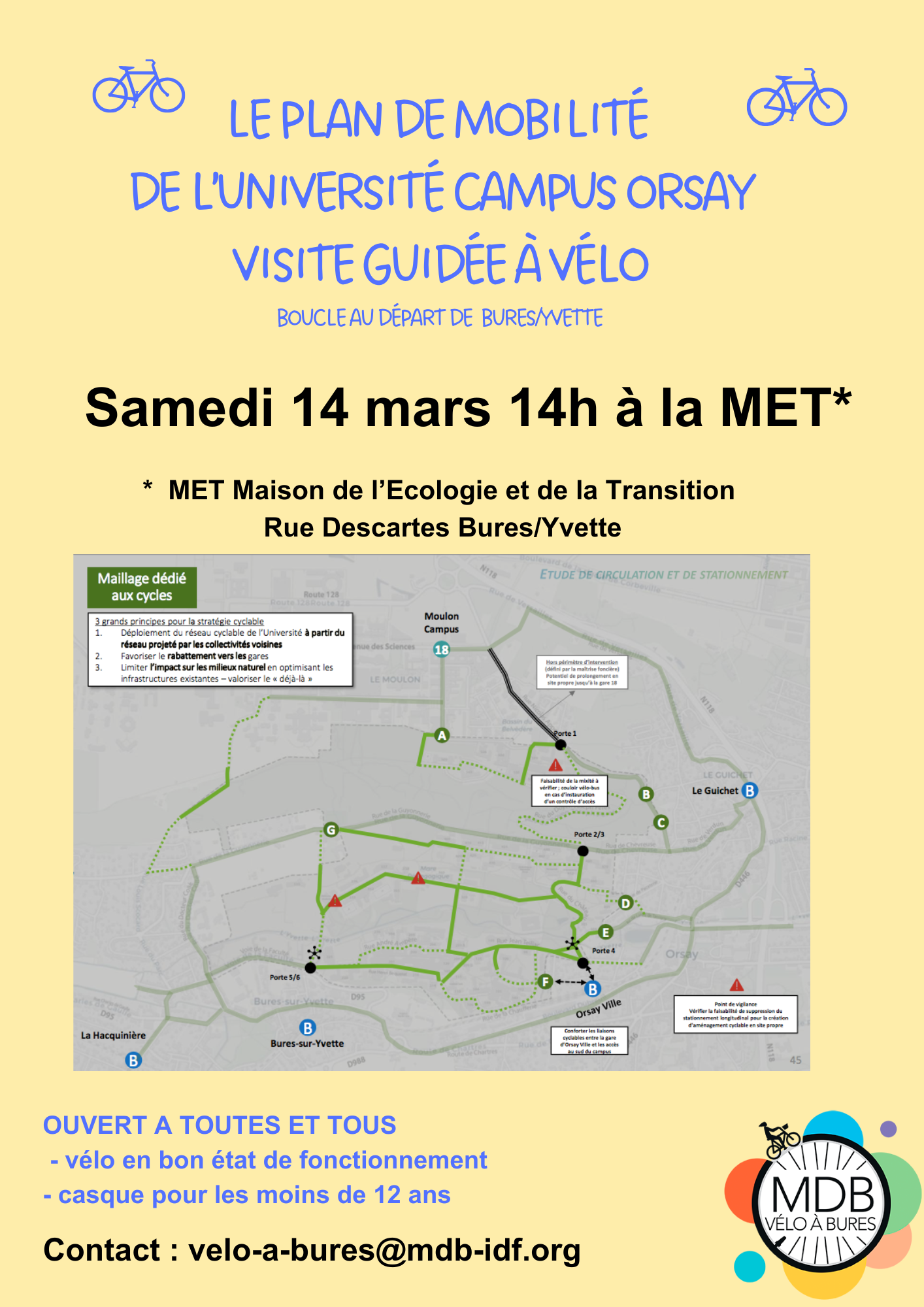 Alors que l'Université vient de s'engager pour un plan de mobilité en faveur de l'apaisement et des mobilité douces, on vous propose une visite guidée du campus pour en discuter. Petite boucle au départ de la Maison de l'Ecologie à Bures/Yvette.