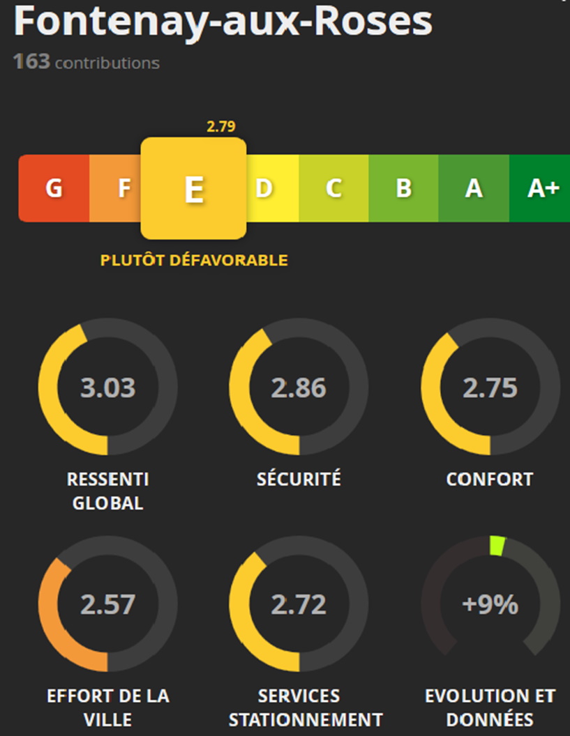 La ville de Fontenay-aux-Roses obtient la note de 2,79 sur 6 (note E sur une échelle de G à A+) soit un climat « plutôt défavorable ». On note une légère amélioration par rapport aux résultats du baromètre 2017, où la ville avait obtenu le score de 2,66, mais les « points noirs » et « tronçons à améliorer » sont toujours les mêmes. La question sur l’amélioration ou la dégradation de la situation depuis deux ans ne montre pas d’évolution notable: plus de la moitié des répondants indique que la situation n’a pas changé.