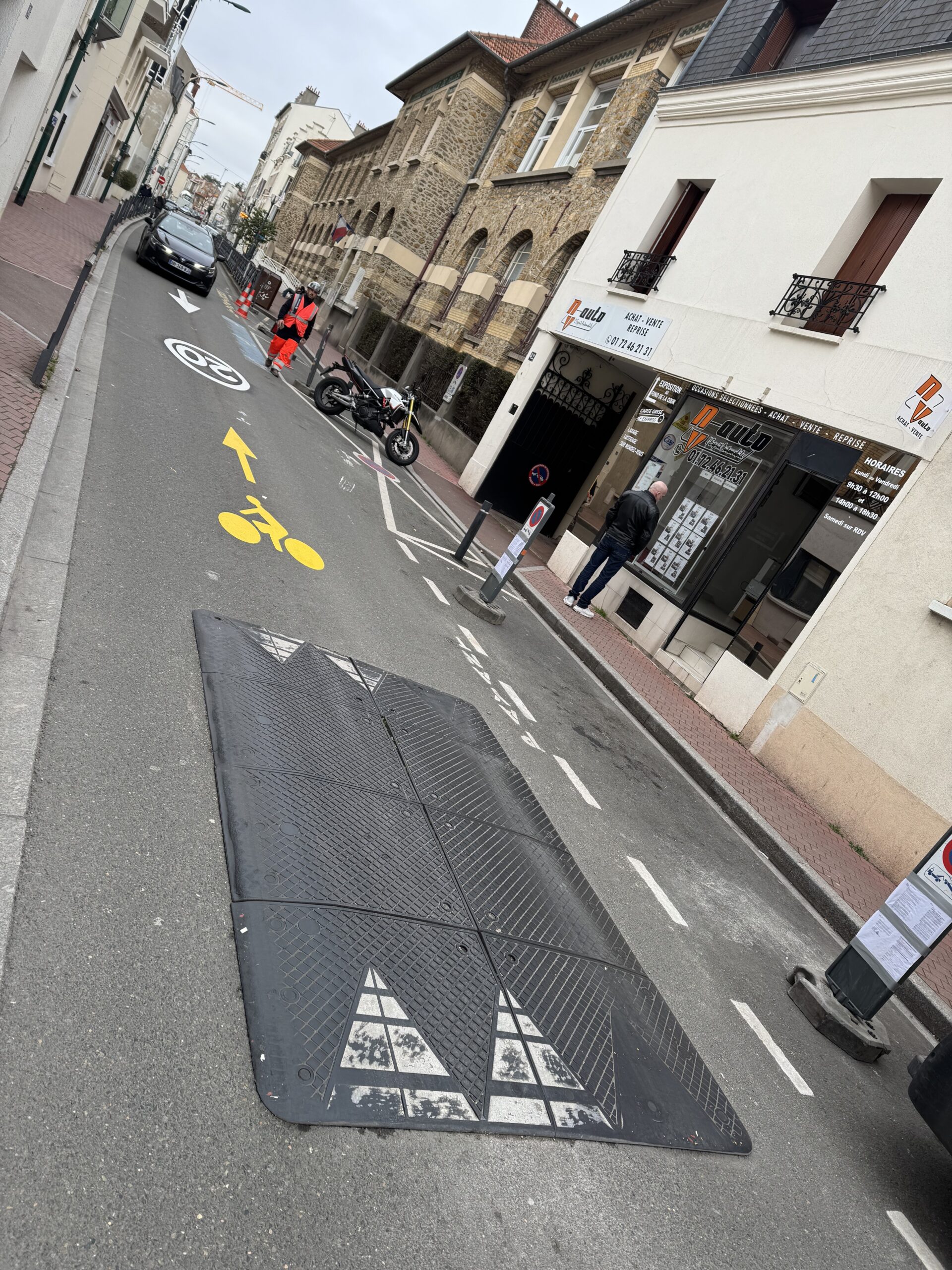 La fin de la piste cyclable est ratée : un angle droit puis un cédez le passage se terminant dans le couloir bus non élargi. Une barrière tente d’empêcher le parcours naturel