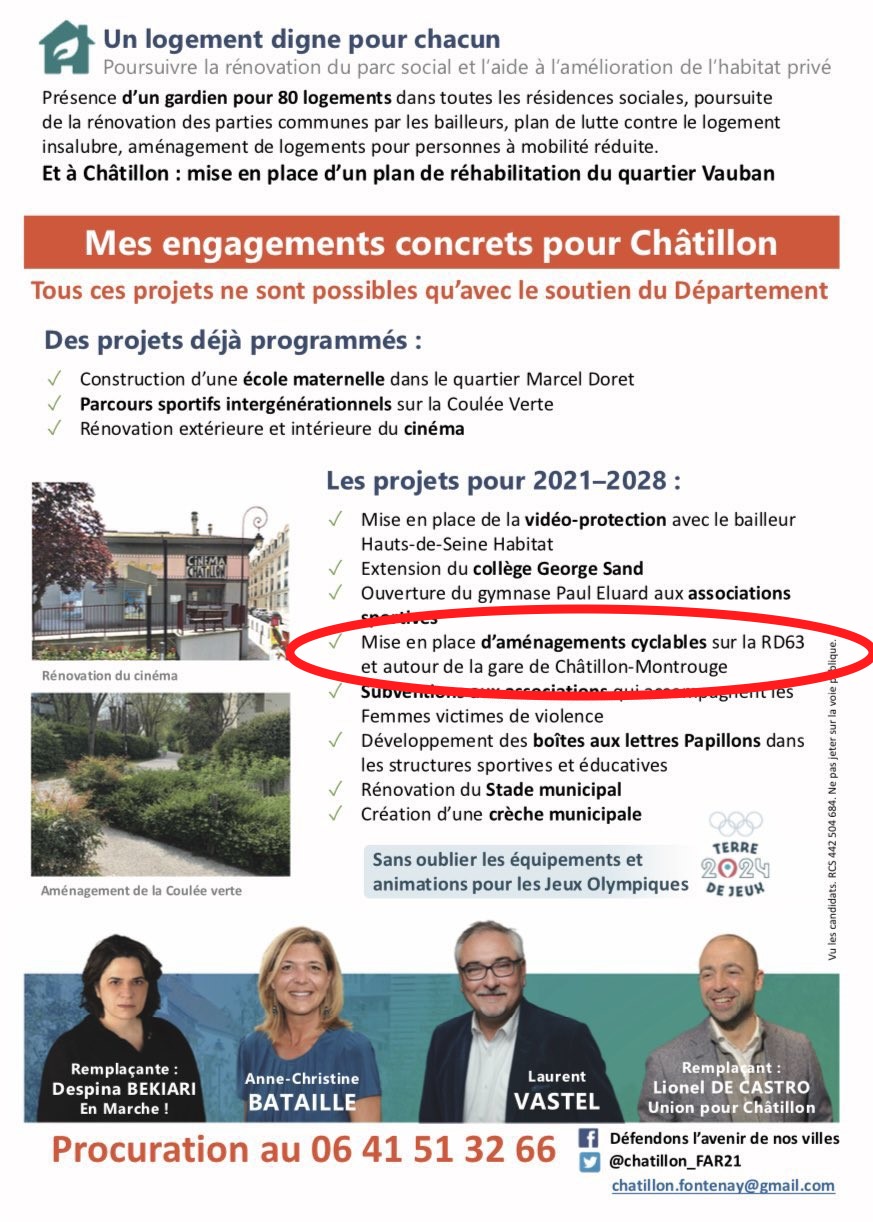- Le soutien de la conseillère départementale de Fontenay-aux-Roses pour une RD63 cyclable dans les deux sens : ici.