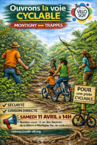 VéloSQY propose à ses adhérent.es et à toutes les personnes qui le souhaitent une action (symbolique) de défrichage et d’entretien sur le tronçon Montigny-Trappes pour mieux se déplacer à vélo à SQY.