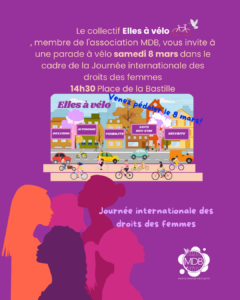Le collectif Elles à vélo vous invite à une parade à vélo le 8 mars dans le cadre de la journée internationale des droits des femmes.