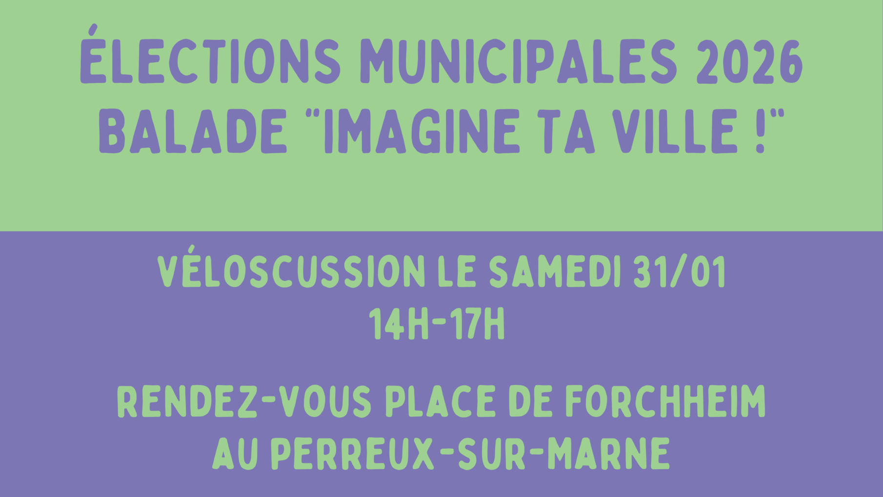 L’antenne perreuxienne de MDB vous propose une véloscussion dans le cadre des élections municipales de 2026. Nous déambulerons (à vélo) dans les rues du Perreux-sur-Marne, reliant différents points d’intérêt afin de demander aux présent·es d’imaginer leur ville idéale, à hauteur de piéton et de cycliste. Les deux candidat·es déclaré·es et leurs équipes seront également présent·es lors de cette sortie que nous voulons la plus ouverte, constructive et conviviale possible ! Il s’agira aussi pour nous d’introduire différents points du « programme vélo » que nous avons concocté et soumettrons aux candidat·es dans les jours à venir lors de rendez-vous dédiés.