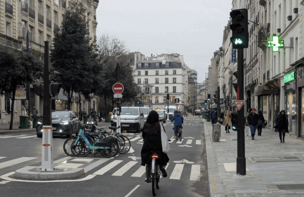 - des passages piétons régulés par le feu tricolore, avec une « pression piétonne » telle qu’elle déborde de la largeur du passage piétons. Certain·es se positionnent donc sans s’en rendre compte entre le feu et les cyclistes qui s’en approchent. C’est notamment le cas le long de la Rue de Rivoli (4e) et des quais de la rive gauche.