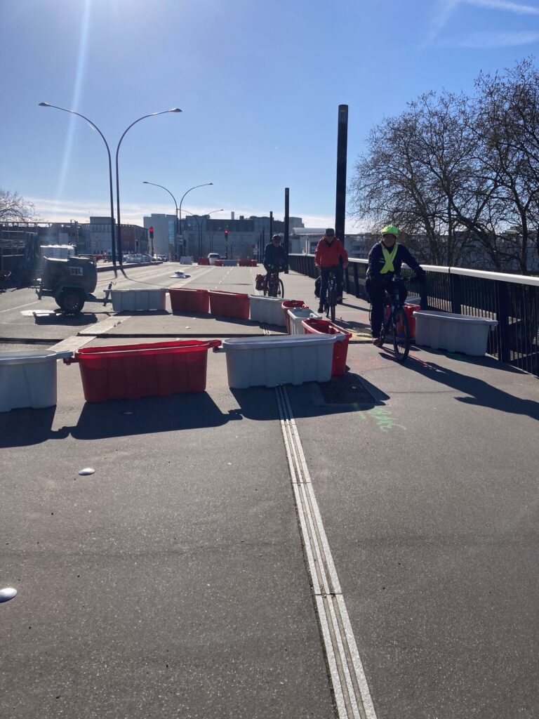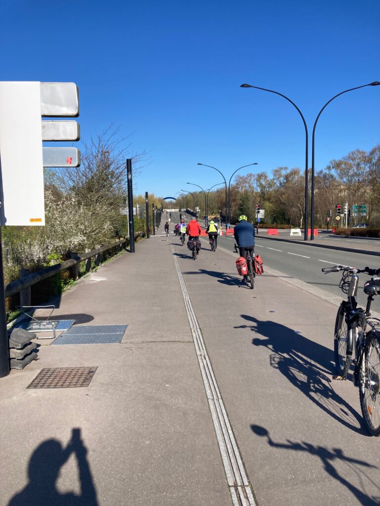 Ce fut l’occasion encore une fois de comparer les aménagements cyclables et de pratiquer le saut de barrières et chicanes. Entre autres, dès le départ, le constat fut général pour réclamer un aménagement cyclable sécurisé, depuis la gare de St Quentin en Y, jusqu’au vélodrome. Le futur aménagement en projet prévoit certes des bandes ou voies cyclables, mais en maintenant une traversée de la deux fois deux voies reliant la place Pompidou au vélodrome très périlleuse pour les cyclistes!