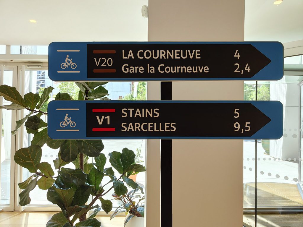 Celle-ci reprend le bleu d’Île-de-France Mobilités, avec des panneaux sur fond anthracite. À l’exception du métro qui dispose d’une charte graphique propre – et des routes qui ne relèvent pas de la compétence d’IDFM -, le vélo rejoint les autres modes de transport dans l’identité visuelle de notre autorité organisatrice.