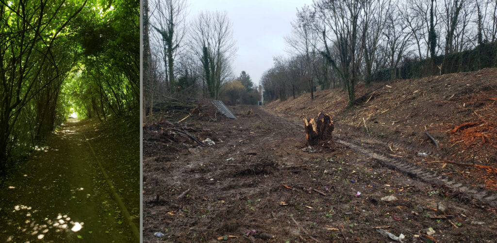 C’en est fini du petit coin de fraîcheur l’été à cet endroit et de la biodiversité qu’il abritait… (voir photo avant/après). Ce chemin de circulation partagée, tel qu’il existait déjà, ne requérait que des aménagements très modestes.