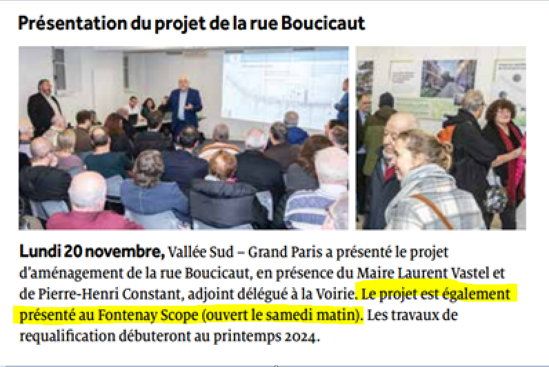 Le maire de Fontenay-aux-Roses a lancé un projet de rénovation de la rue Boucicaut, le cœur de Fontenay-aux-Roses. Faute de concertation et d’informations sur les sites de la Ville et du Territoire, les citoyens ont lancé une pétition signée par quatre associations, et organisent une manifestation devant la mairie le 9 mars 2024 à 11 heures.