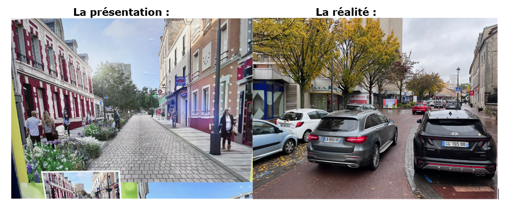 - La présentation du projet est trompeuse : la photo du projet ci-dessous, visible au Fontenayscope et sur les panneaux municipaux, montre une rue qui a l’air piétonne, avec une voiture à peine visible au loin, alors que le trafic actuel ne sera aucunement modifié :