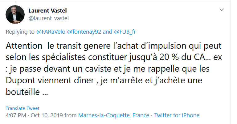 Dans l’ancien monde, on pensait qu’il fallait beaucoup de voitures dans la rue pour faire marcher le commerce. C’était le temps du « no parking, no business ». En 2019, de nombreuses villes ont coupé le transit des voitures en centre-ville et le commerce a fleuri. Pourtant le maire de Fontenay-aux-Roses hésite encore à réduire la présence de l’automobile dans la rue commerçante principale car cela risque de tuer le commerce écrit-il: