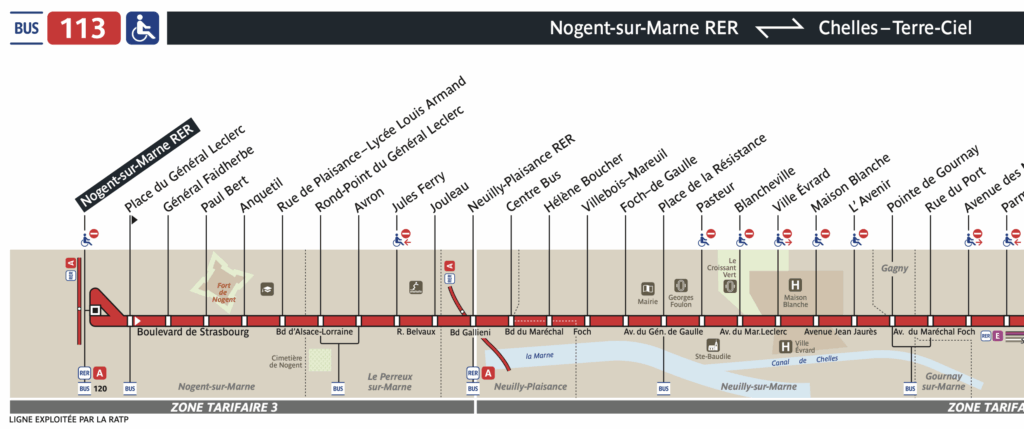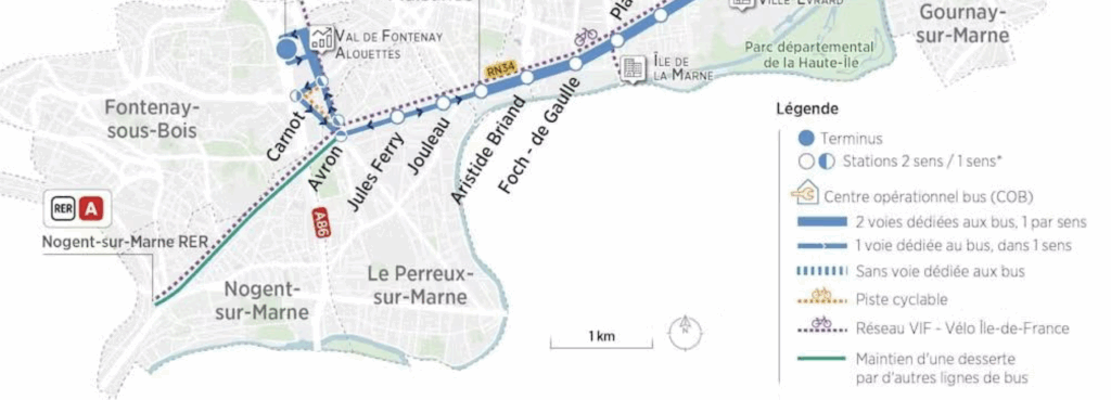Là où le bus 113 s’arrête aujourd’hui à la gare bus de Nogent-sur-Marne, liée au RER A (branche Boissy-Saint-Léger), le Bus Bords de Marne s’arrête effectivement à Val-de-Fontenay, pôle multimodal existant et destiné à se développer encore plus avec l’arrivée de la ligne 15 du Grand Paris Express, l’extension du tramway T1 et possiblement le prolongement de la ligne 1 du métro, dont la seconde enquête d’utilité publique est ou va être lancée sous peu.