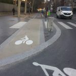 La piste cyclable sur trottoir sur l’avenue de la Porte Pouchet a enfin son revêtement. Son arrivée est particulièrement tortueuse… à cela s’ajoute cette traversée cyclable étonnante. A quoi sert-elle