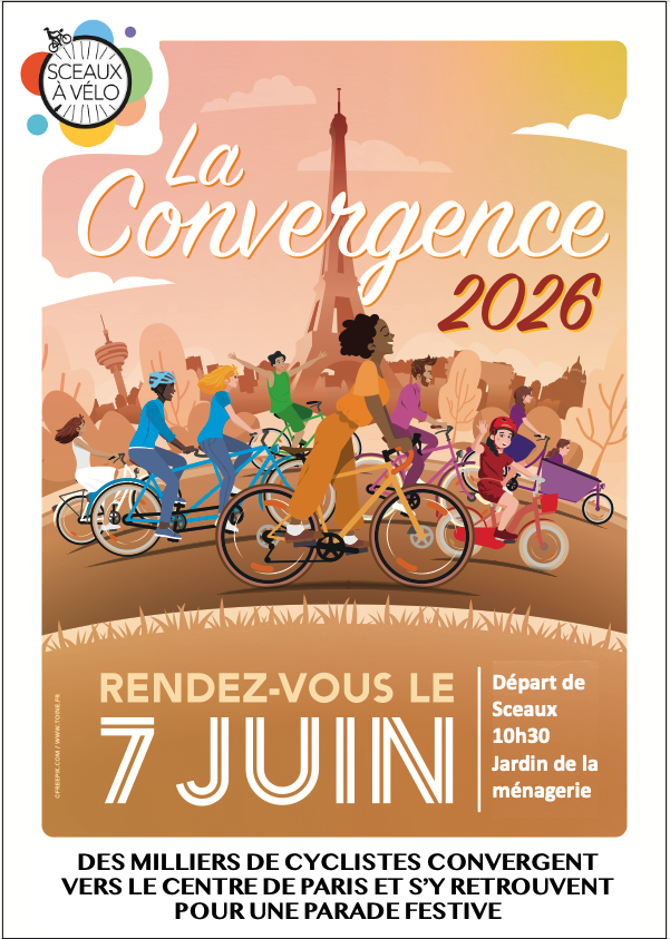 Comme chaque année, Sceaux à vélo participe à la Convergence. Organisée par MDB, la Convergence rassemble plusieurs milliers de cyclistes qui, de toute l’Île-de-France, convergent vers le centre de la capitale. Plus de 100 départs sont organisés dans toute la région et l’un des convois traverse Sceaux avec un point de rendez-vous sur la ville en fin de matinée. Arrivée au centre de Paris, c’est alors un pique-nique géant de plusieurs milliers de cyclistes qui, une fois restaurés, réenfourchent leur vélo pour, tous ensemble, faire un petit tour remarqué dans la capitale. Applaudis par les passants et les touristes mais pas toujours par les automobilistes !