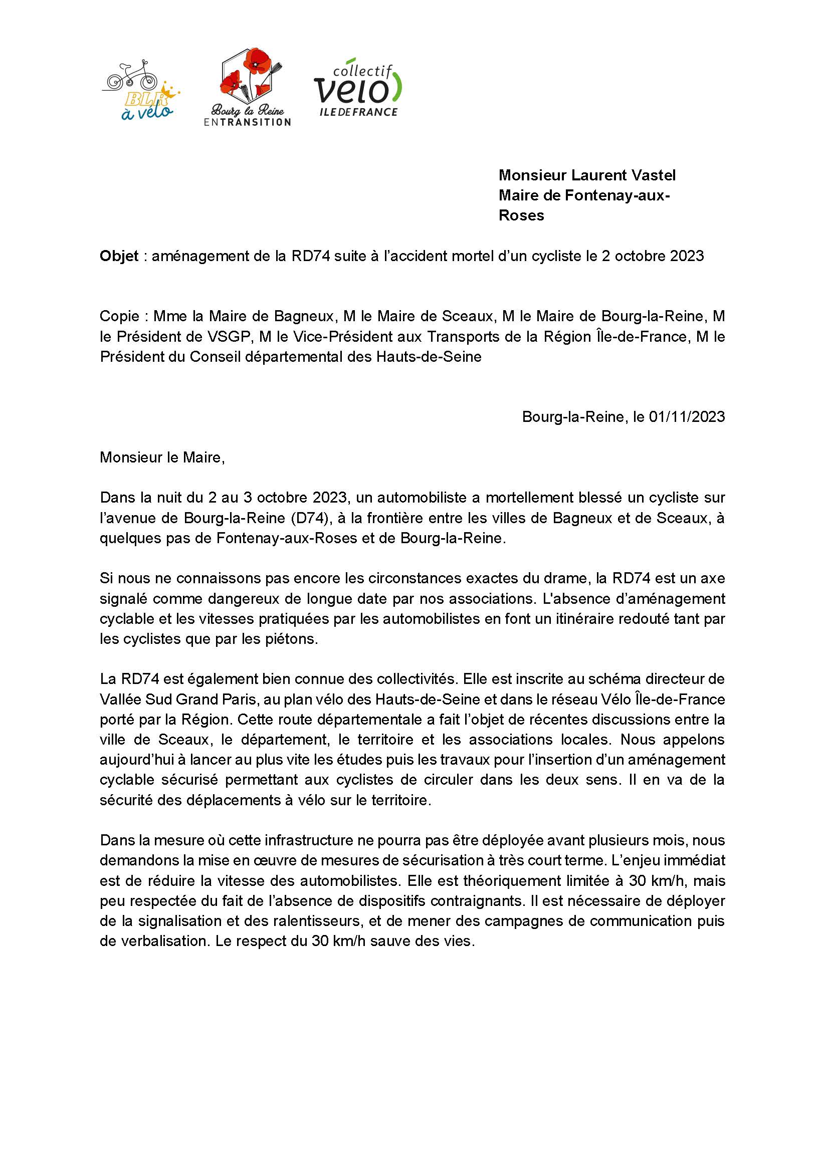 Avec une grande émotion nous avons appris que dans la nuit du 2 au 3 octobre 2023, un cycliste de 48 ans a été tué sur la RD74 par un automobiliste à quelques pas de Fontenay-aux-Roses. Nos pensées vont à la famille, dont nous partageons la tristesse et, nous l’imaginons, la colère.