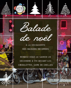 Rejoignez-nous pour une balade à vélo dans les rues de Chelles à la découverte des plus belles maisons décorées pour Noël. Rendez-vous devant les Ciboulettes, gare de Chelles. Vélos décorées