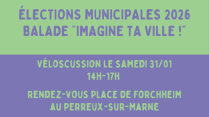 L’antenne perreuxienne de MDB vous propose une véloscussion dans le cadre des élections municipales de 2026. Nous déambulerons (à vélo) dans les rues du Perreux-sur-Marne, reliant différents points d’intérêt afin